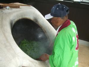 尽管如今的茶叶加工普遍已经借助现代机械完成,嬉野却始终坚守传统工艺。新鲜采摘的茶叶被放入架在石头炉灶的巨大铁锅中,保持300°C以上的锅温,有节奏地用手不断翻炒,以防茶叶炒焦。炒制完成后,继续用手揉捻茶叶,使之定型为蜷曲状。