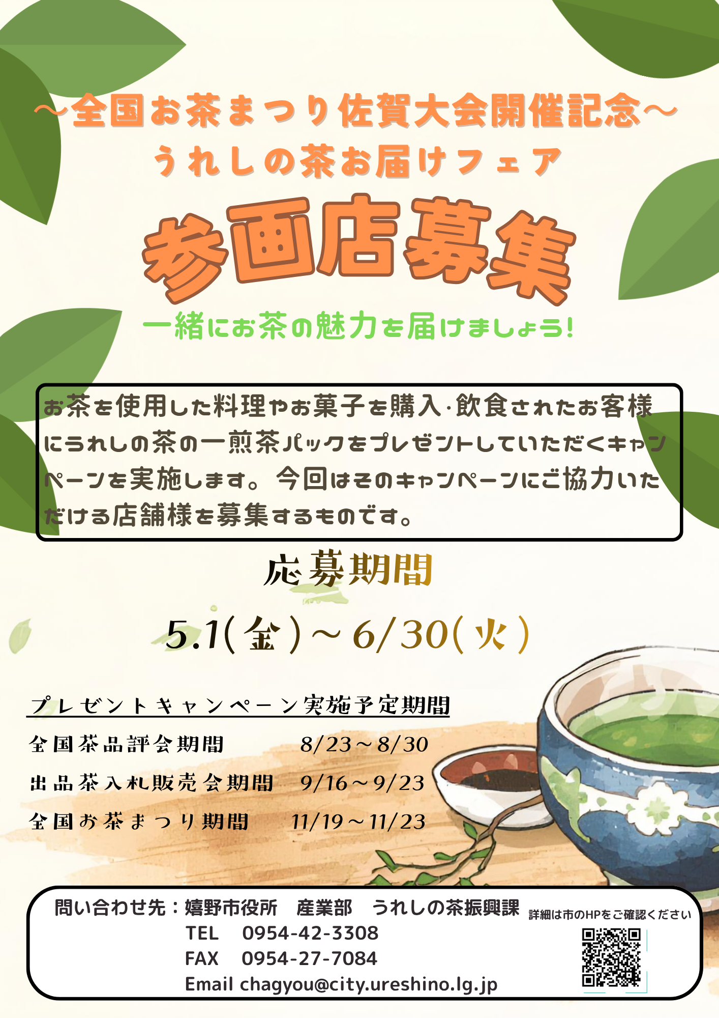 0954-42-3308(嬉野市役所 うれしの茶振興課)