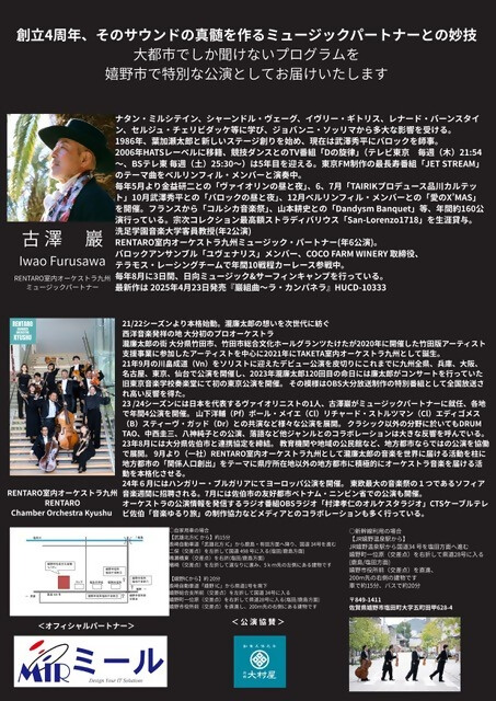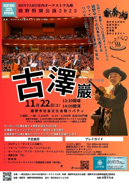 九州で一番新しいプロ室内オーケストラと嬉野ゆかりのヴァイオリニスト古澤巖の特別公演を今年もリ バティで開催します。