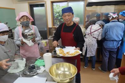 10月28日(金)健康福祉部会による「料理教室」が開催されました。今回は「国産鶏肉を使った料理」に皆さん挑戦。本村良子さんはじめ食改協の皆さんのご協力で進められ、男性参加者のエプロン姿も板について、健康的でおいしい料理に舌鼓を打ちながら楽しく会食しました。