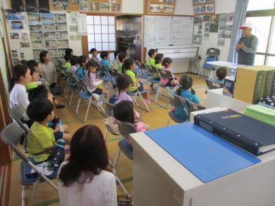 大草野コミュニティが、令和4年度に作成した「大草野お宝48」に掲載されている箇所を、和光幼稚園の年長児さん達を先頭に、歩いて回ってくれています。そのうちの一つとして、研修センターを訪ねてきてくれました。今年度から会長に就任した香田新会長の初仕事です。このような子ども達の小さな学びが、やがて実を結び、「緑の郷大草野」への愛情へと育って行ってくれたらと願います。