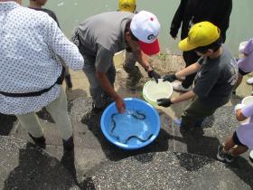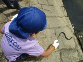 今年で5回目の稚魚放流です。昨年から、放流場所を変えて板井手堰のそばの階段状の場所で行っています。先生が4年生に「ウナギの放流をしたことがある人?」と聞くと、一人手を挙げる子がいて、この行事で、年長さんのときに経験した子でした。「5回目になるから、もうそうなるのか!」と感慨深い気になりました。