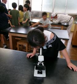 昨年、新しくできた人工池で今年の4年生が初放流です。毎年、卵を産ませ、幼虫を孵化させるなどのお世話をしていただいている一ノ瀬さんから放流のときの注意を聞いたあと、幼虫を紙コップに入れて、全員でカウントダウンして、人工池に放流しました。引き続き学校に戻って、顕微鏡で蛍の幼虫観察です。今年はみんなすんなり顕微鏡を覗き込むことができました。