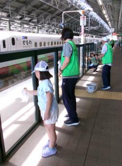 夏休みの最初の日曜日と言うことで、学校に呼び掛けて、子ども達にも参加してもらいました。子ども達だけでも15人近くいました。全体では、40人を超えていました。駅のホームは、外とほぼ同じなのでやっぱり暑かったです。子ども達はどう感じてくれたでしょうか?「もういいや!」ではなく、「またやりたい!」であってくれたらいいなと思います。