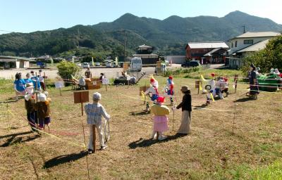今年は、大草野小学校開校150周年の年に当たりますので、大草野小学校に因んだテーマを各部会で決めて、案山子の制作をすることになりました。かかし祭りをぜひ成功させようと目の色を変えて頑張っています。今年は、もとスーパーすぎみつの跡地と小学校グラウンドの間にある空き地を借りて、10月12日(日)から26日(日)まで展示します。校区の皆さん、家族そろって会場へおいでください!