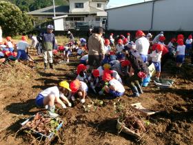 今年は、ここ数年コスモス畑にしていたところに芋を育てることにしました。さてデッカイ芋は入っていたのでしょうか!?大きな芋が見つかるたびに、いえ、たとえ小さくても、見つけた時の嬉しさは格別のようで、大歓声でした。2時間目は、いつものように和光の年長さんと1年生が芋ほりをして、楽しんでくれました。