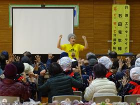 12月7日(日) 、毎年恒例の「不動ふれあい祭り」が開催されました。午後からは、コミュニティが時間と場所をお借りして石田竜生さんの「笑って☆笑って介護予防」の講演を実施させて頂きました。脳トレや体操を不動地区の皆さんに面白おかしく厳しいツッコミを交えてご指導頂きました。