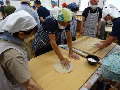 7月27日(日)9:30〜13:00、コミュニティにて「そば打ち体験」を開催し、総勢23名のご参加を頂きました。ご指導はおなじみの塩田コミュニティの岸川会長と部会員・事務局長の4名様。1枚500gの二八そばを打つのに皆さんこねてこねて200回!伸ばして折ってを繰り返し、湯がいて冷やして薬味をそえて頂きました。