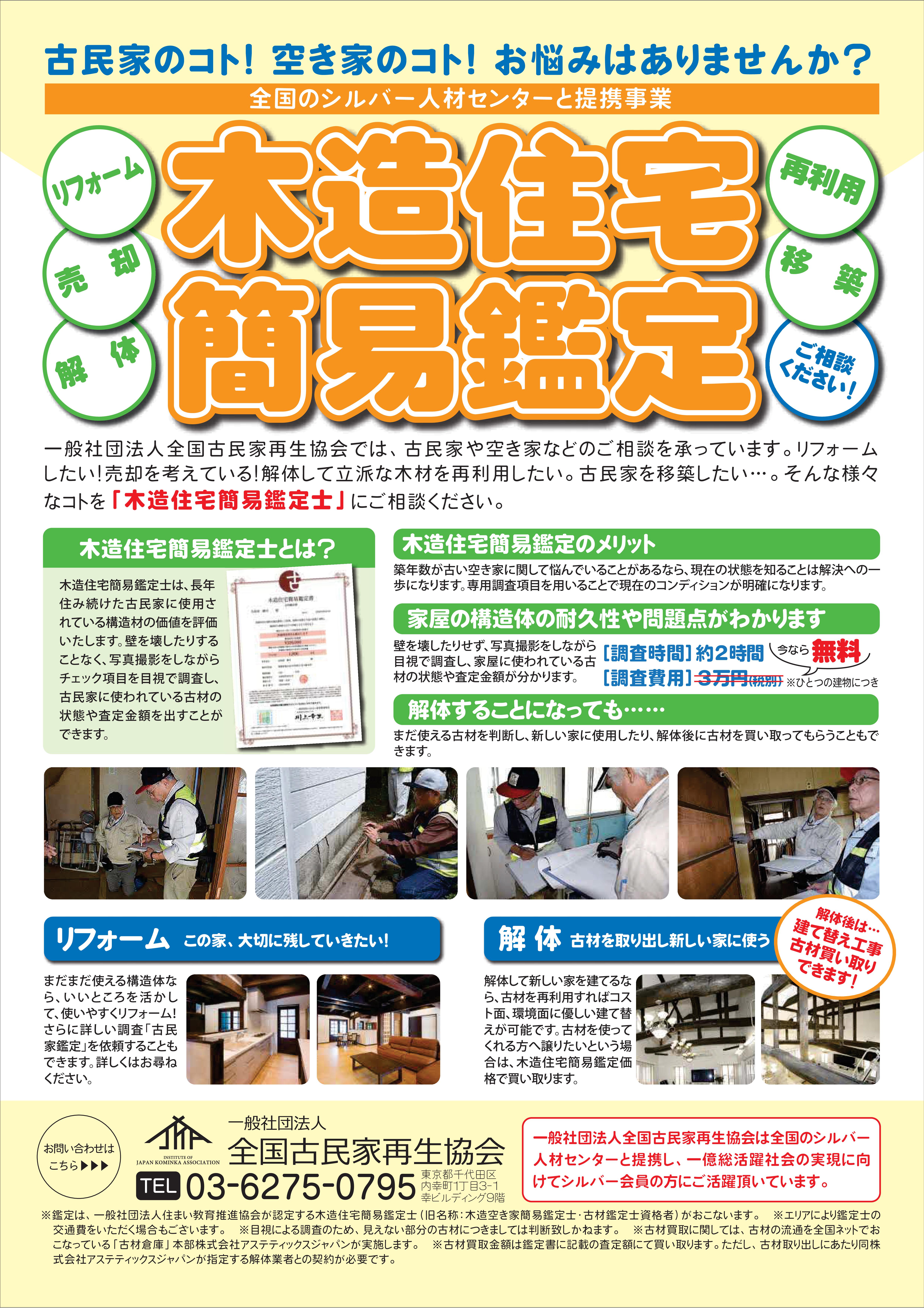 一般社団法人全国古民家再生協会では、各地のシルバー人材センターと連携して「木造住宅簡易鑑定士」による簡易診断をおこなっています。