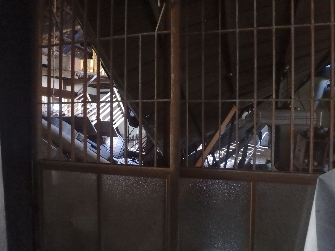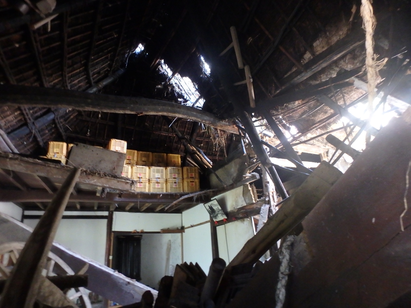 写真で見ると茅葺屋根のへこんでいるあたりです。梁も外れていました。