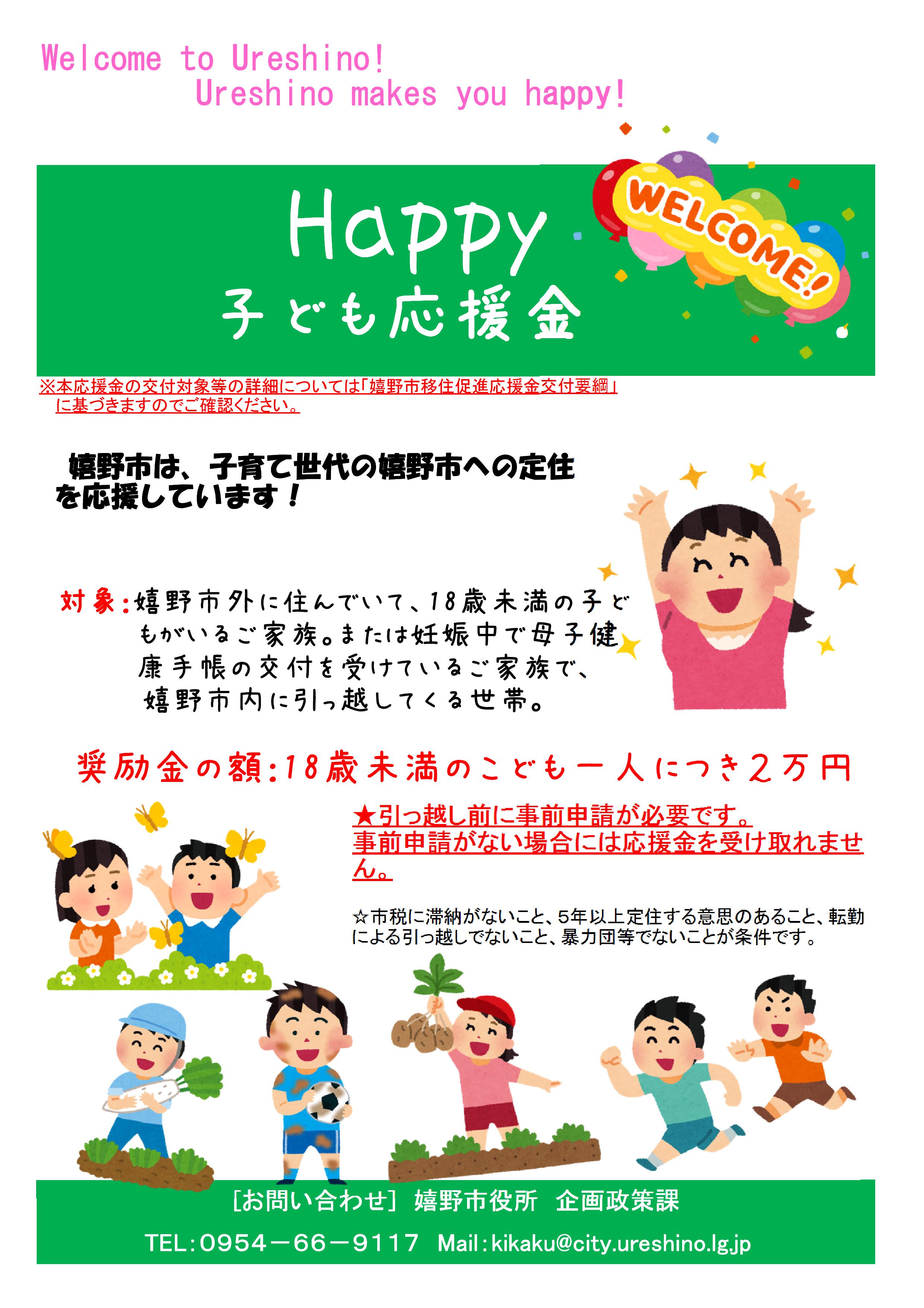 嬉野市では、市外にお住まいの方が嬉野市内に転入された場合の応援金を9種類用意しています!