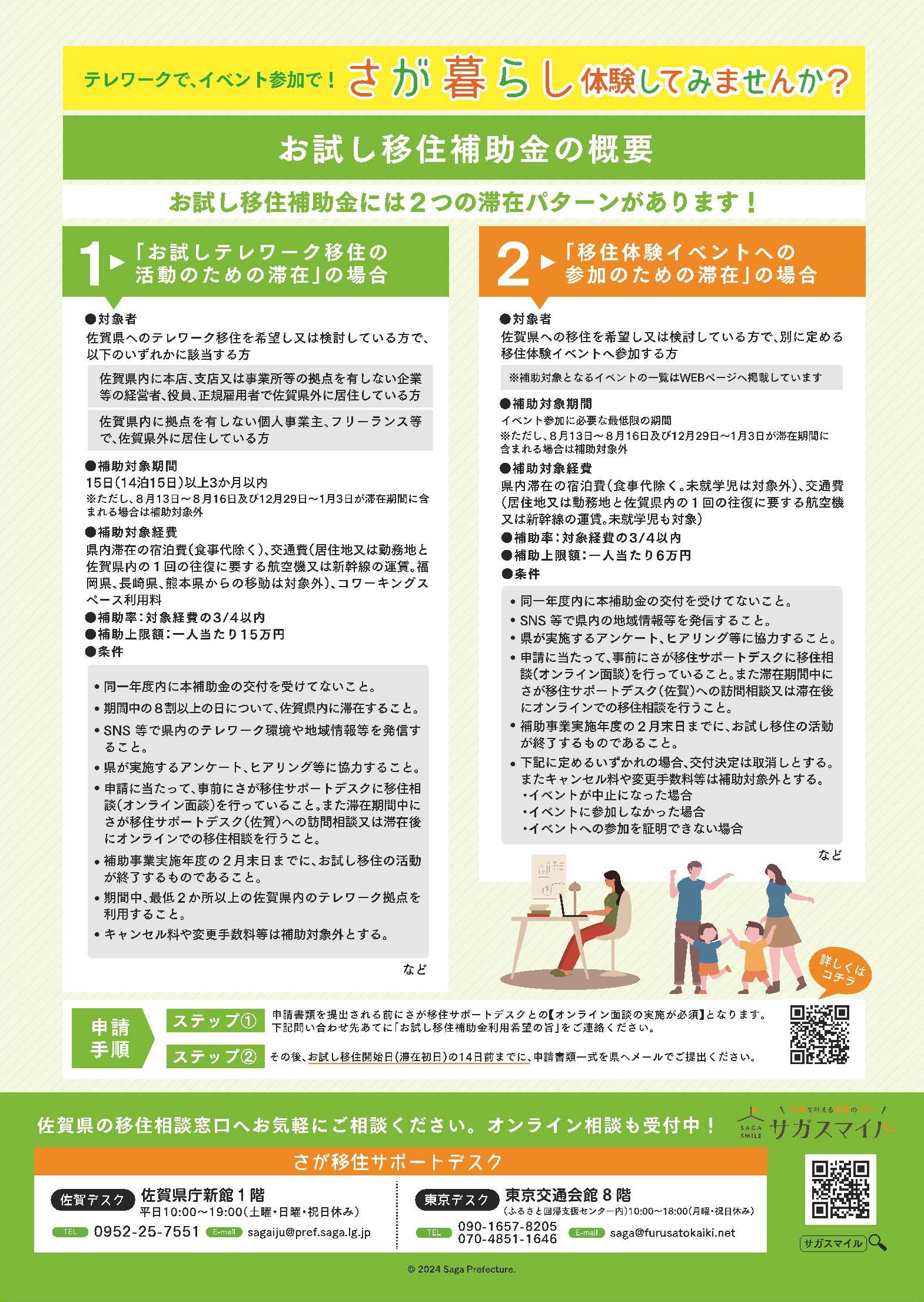 佐賀県では、テレワーク移住や移住体験イベント参加に関する移住支援策として、「お試し移住補助金」を実施しています。