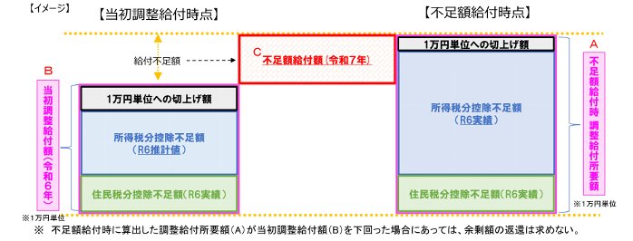 今回の「不足額給付時算出時点の調整給付額」と、令和6年に給付した「当初調整給付額」に生じる不足額を1万円単位で調整して算出します。