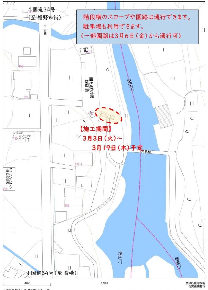 日頃から、轟の滝公園をご利用いただきありがとうございます。このたび、園路の改修工事を行っております。日頃のお散歩や遊具の利用、観光でご訪問の方には、大変ご迷惑をおかけいたしますが、ご理解とご協力を賜りますようお願いいたします。