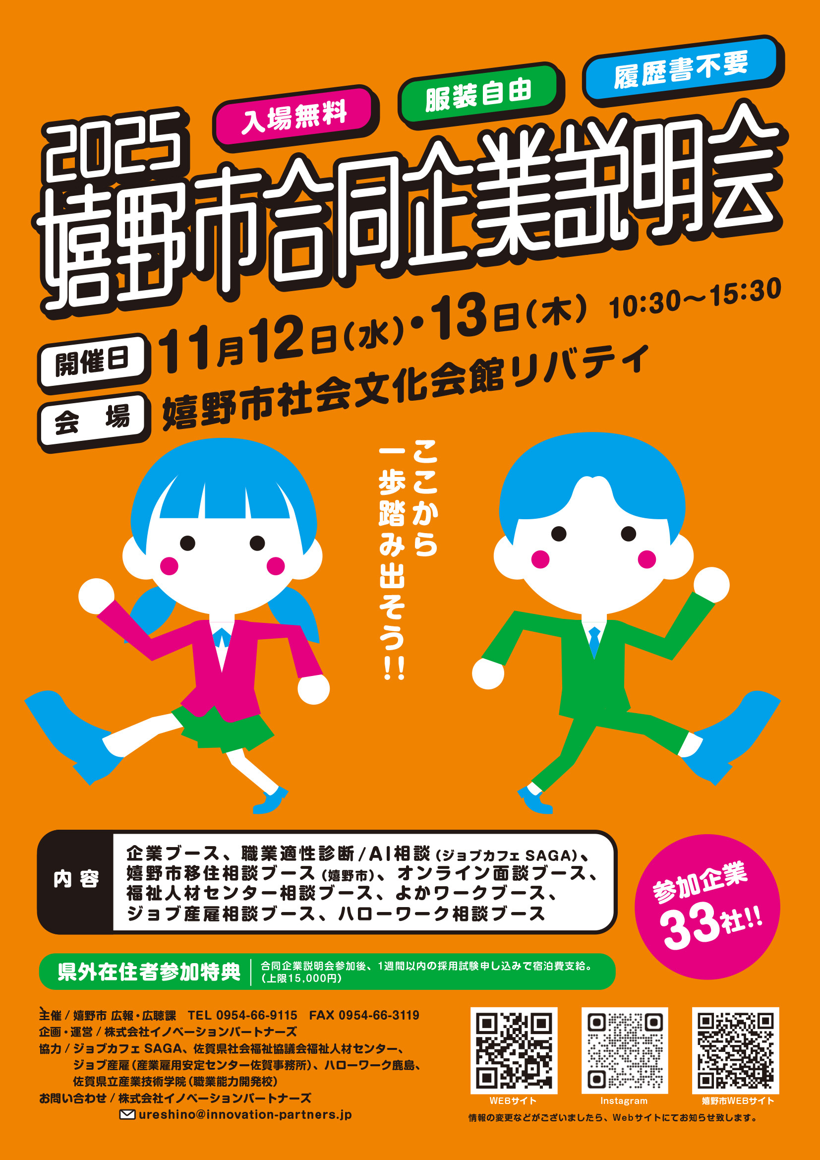 嬉野市では企業誘致による進出企業や既存の市内企業が、安定した人材確保ができ将来にわたり事業を継続できるよう、求職者及び学生等に対し、嬉野市内の企業を周知し、人材確保及び市内雇用情勢の改善、移住定住促進を図る目的で、下記のとおり合同企業説明会を実施いたします。