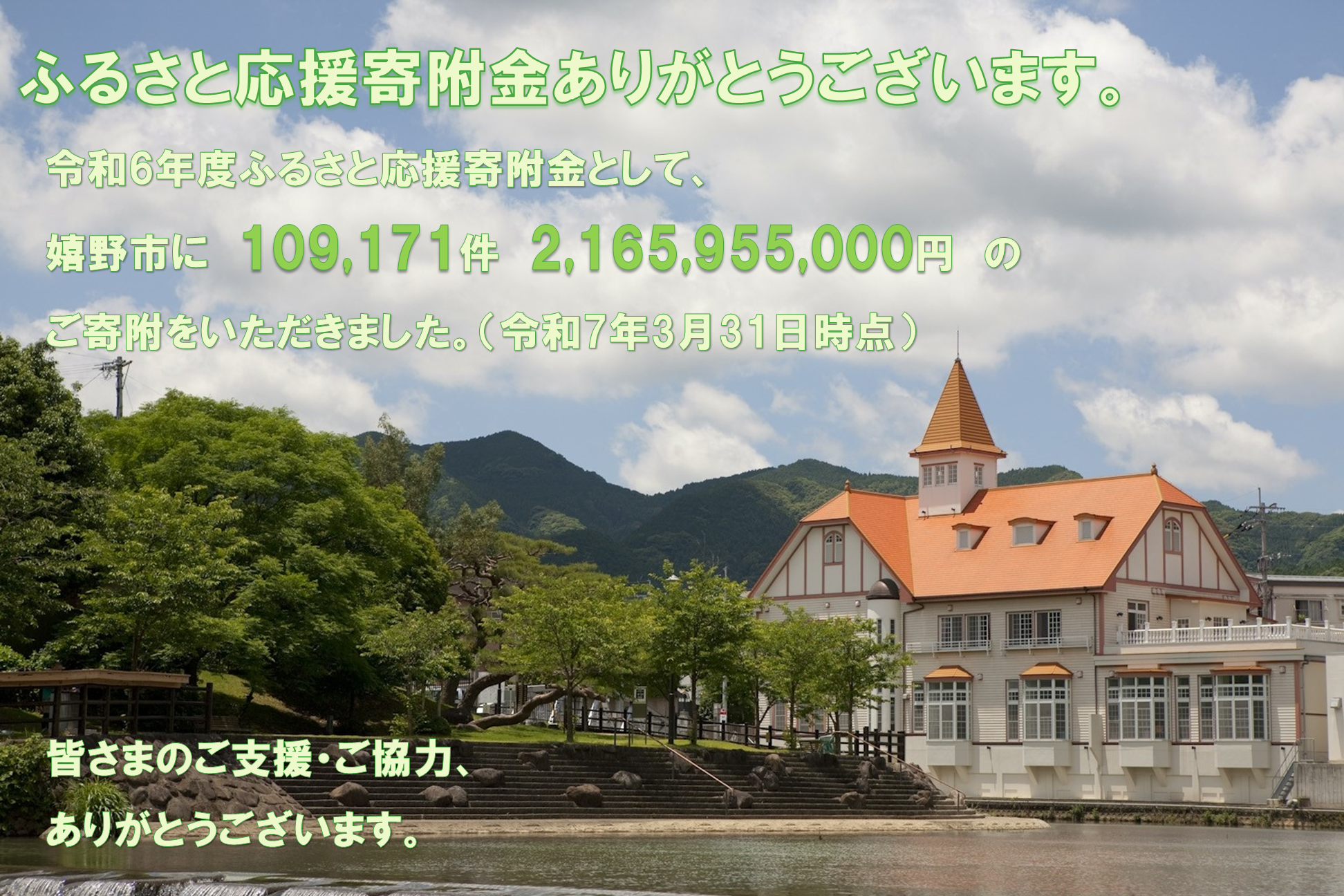 皆さまのお心遣いを活かし、これからも故郷を愛する心を育み、もっと「うれしの」を元気にしていきたいと考えています。どうぞ温かいご支援を賜りますようお願い申し上げます。