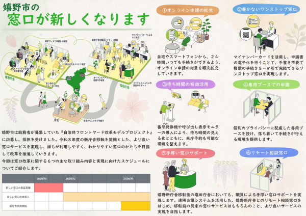 嬉野市は、総務省が募集していた『自治体フロントヤード改革モデルプロジェクト』に応募し、採択を受けました。令和8年度の新庁舎移転を契機とした、より良い窓口サービスを実現し、誰もが利用しやすくわかりやすい窓口のかたちを目指して改革を推進していきます。