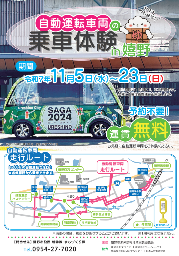 自動運転に関心がある方や最新テクノロジーを体感したい方はもちろん、嬉野を訪れる観光客の皆さまにもぜひご乗車いただければと思います。運賃は無料、予約不要ですので、より多くの方のご乗車をお待ちしています。