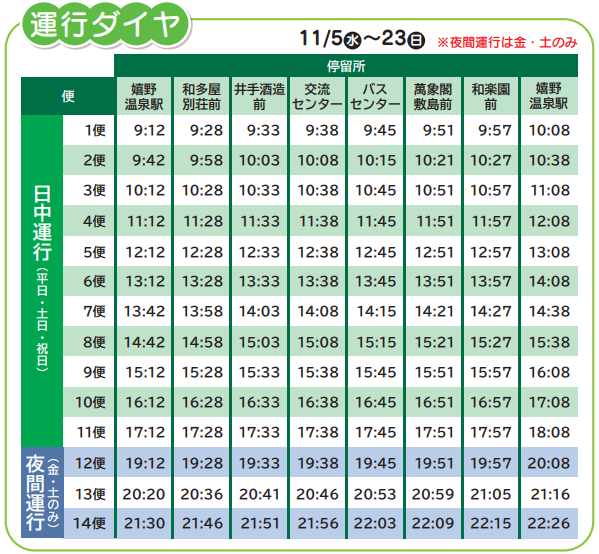 ※19,20,21時台の夜間運行は、金・土限定で運行!