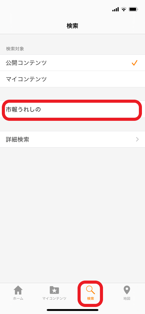2.アプリを起動させ、「市報うれしの」を検索