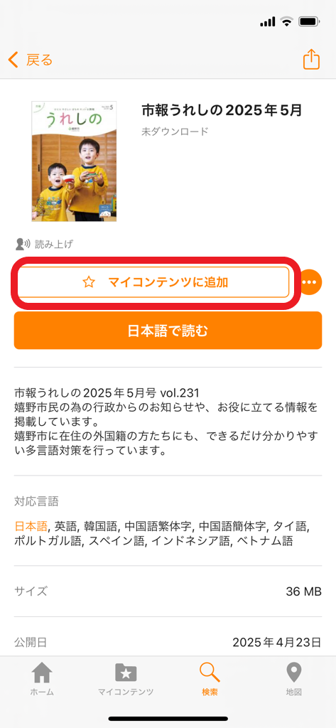 アプリ内で市報うれしのを「マイコンテンツに追加」することで、新しい記事が配信された際にプッシュ通知でお知らせします。