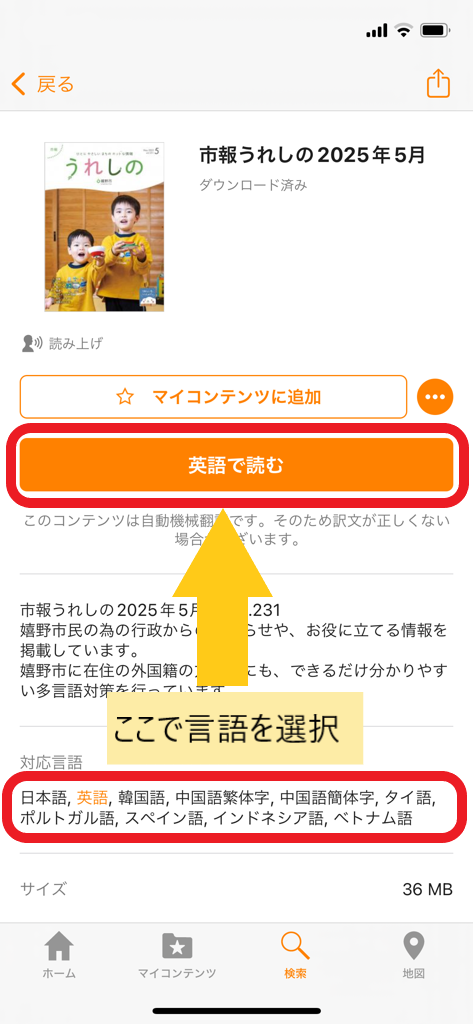 - 「日本語で読む」の部分が選択した言語に変わったことを確認してタップ