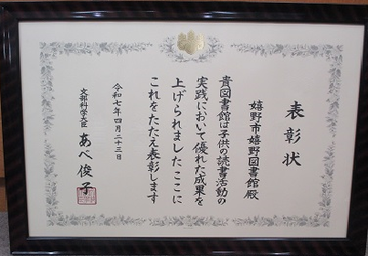 嬉野図書館が子供の読書活動の実践において文部科学大臣から表彰を受けました。